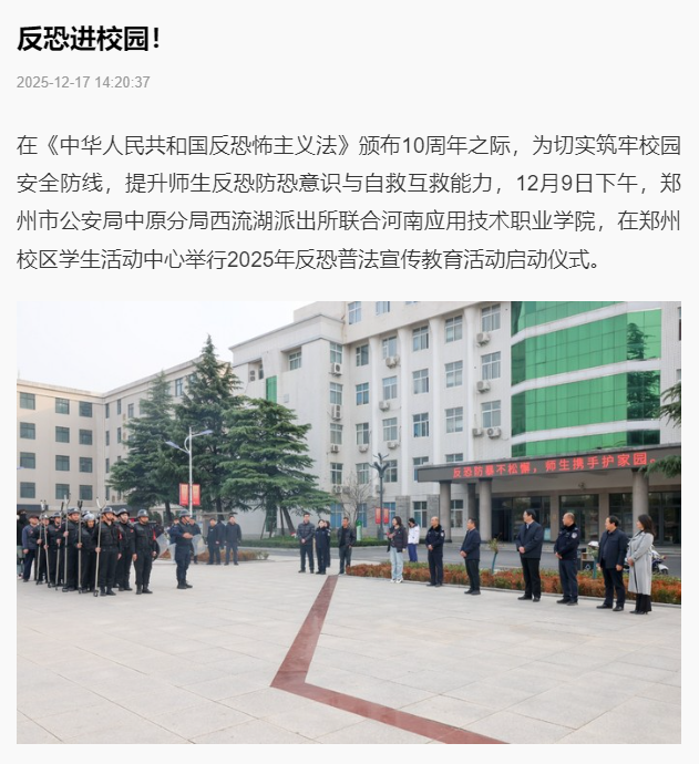 在《中华人民共和国反恐怖主义法》颁布10周年之际,为切实筑牢校园安全防线,提升师生反恐防恐意识与自救互救能力,12月9日下午,郑州市公安局中原分局西流湖派出所联合河南应用技术职业学院,在郑州校区学生活动中心举行2025年反恐普法宣传教育活动启动仪式。