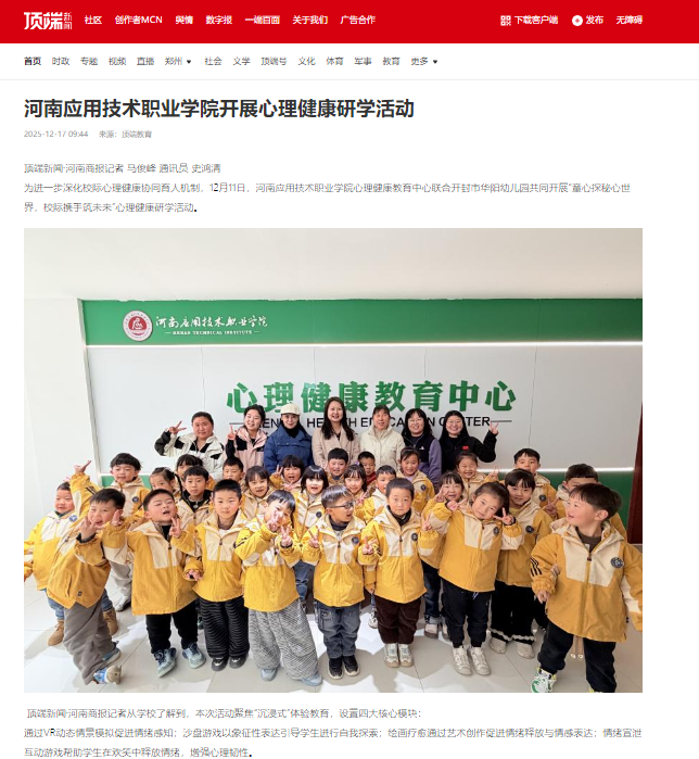 为进一步深化校际心理健康协同育人机制,12月11日,河南应用技术职业学院心理健康教育中心联合开封市华阳幼儿园共同开展“童心探秘心世界,校际携手筑未来”心理健康研学活动。