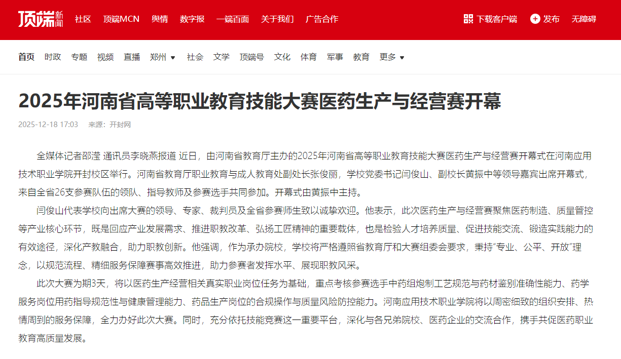 近日,由河南省教育厅主办的2025年河南省高等职业教育技能大赛医药生产与经营赛开幕式在河南应用技术职业学院开封校区举行。河南省教育厅职业教育与成人教育处副处长张俊丽,学校党委书记闫俊山、副校长黄振中等领导嘉宾出席开幕式,来自全省26支参赛队伍的领队、指导教师及参赛选手共同参加。开幕式由黄振中主持。