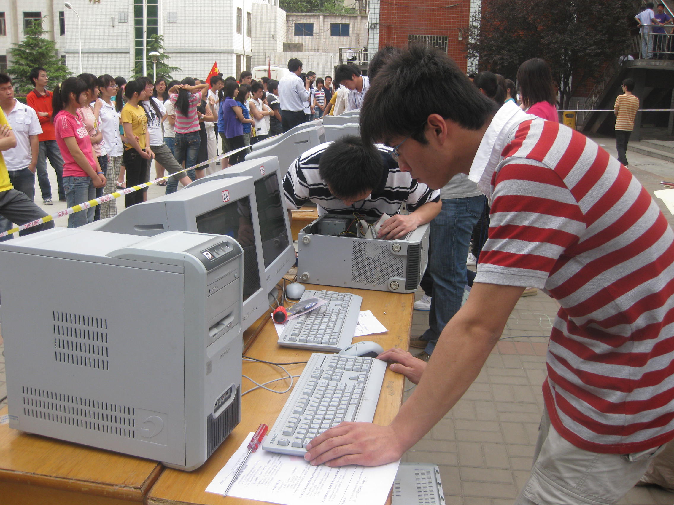 5月19日下午信息工程系第一届计算机拆装大赛决赛在学院广场举行,系主任黄振中老师、系党总支书记刘振民老师及信息工程系部分老师跟踪了全场的比赛。本次大赛参赛对象是信息工程系2007级、2008级所有学生,参赛程序通过报名、选拔、预赛,最终选出前12名选手参加决赛。大赛的主要内容是计算机硬件的拆与装及计算机操作系统、软件的安装,这类比赛体现了信息工程系 “理论与实践相结合,积累实际操作经验” 的宗旨。