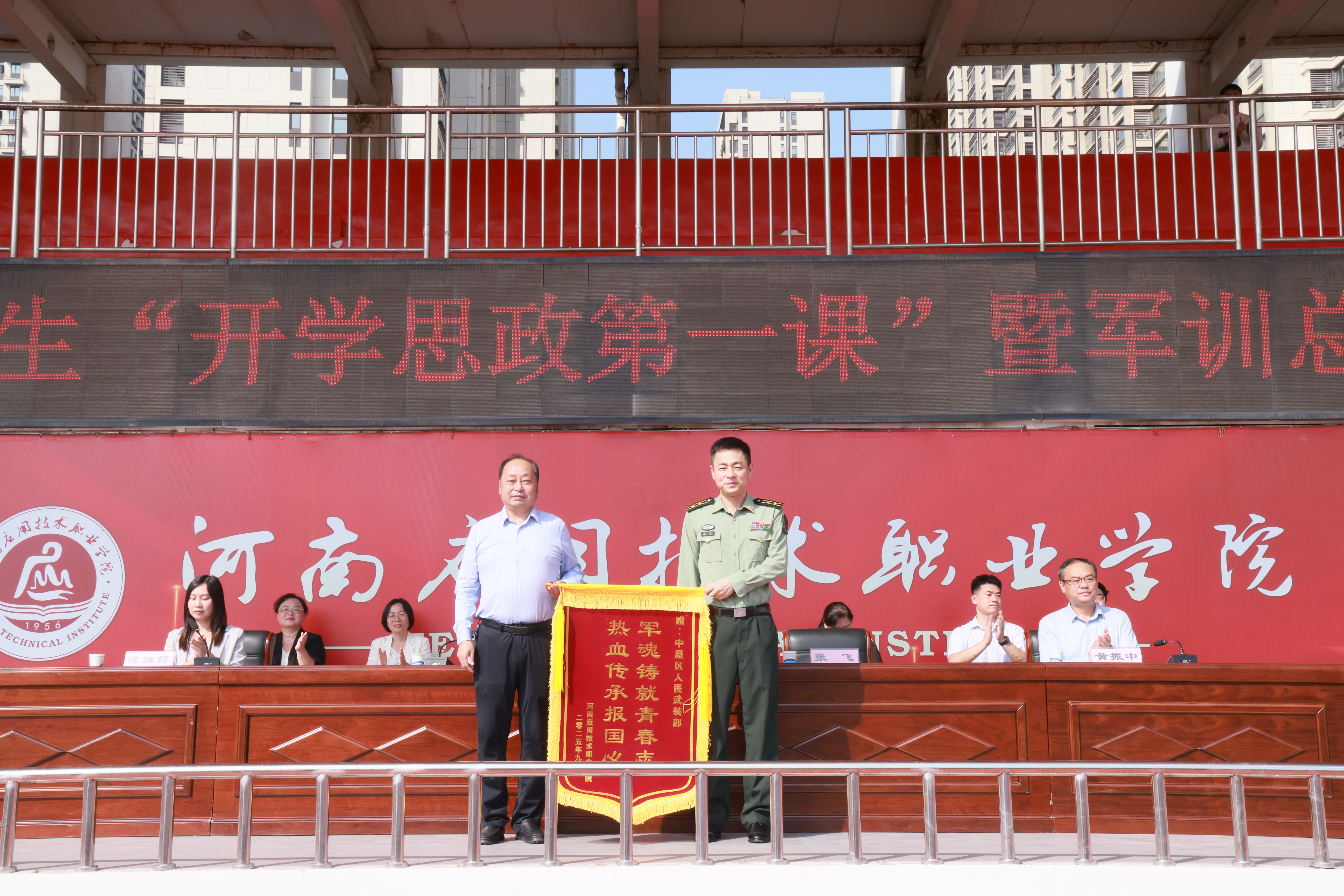 会操结束后,学校对军训中表现优异的集体与个人予以表彰。黄振中、滕文锐宣读表彰决定,校领导为“标兵中队”“标兵宿舍”“军训标兵”及“优秀教官”代表颁发了荣誉证书。闫俊山、薄新党分别代表学校向承训单位——中原区人民武装部、开封市龙亭区人民武装部赠送锦旗,表达对全体教官辛勤付出的诚挚谢意。