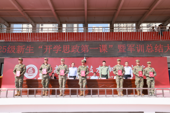 最后,闫俊山、薄新党代表学校向圆满完成军训任务的全体新生表示祝贺,向承训官兵和参与军训工作的教职工表示感谢,同时对全体新生提出三点期望:一是要厚植家国情怀,牢记奋斗方向,将个人理想融入国家发展伟业,勇担时代使命;二是要弘扬工匠精神,练就过硬本领,以精益求精的态度夯实专业基础,提升实践能力;三是要坚持全面发展,夯实人生基石,科学规划学业生涯,提升综合素养和可持续发展能力。