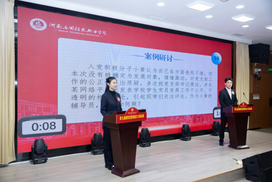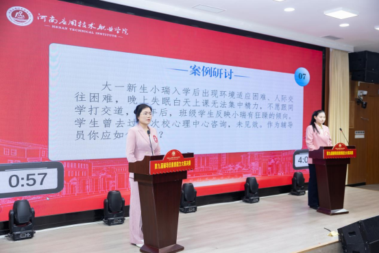 决赛严格对标省级赛事标准,聚焦辅导员核心素养,设置“案例研讨”与“谈心谈话”两大实战环节。所有赛题均源自学生日常教育管理中的真实情境,全面考察选手的理论应用、分析研判及沟通引导能力。案例研讨环节,选手两人一组,围绕学风建设、心理危机、职业规划等随机抽取的复杂案例精准辨析、协同研判,展现出将实践经验转化为系统工作方法的专业能力。