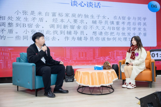 谈心谈话环节高度还原工作现场,选手与助演学生就具体问题深度交流,以共情建立信任,以说理澄清是非,将思想价值引领巧妙融入问题解决过程,彰显了扎实的专业功底与深厚的育人情怀。
