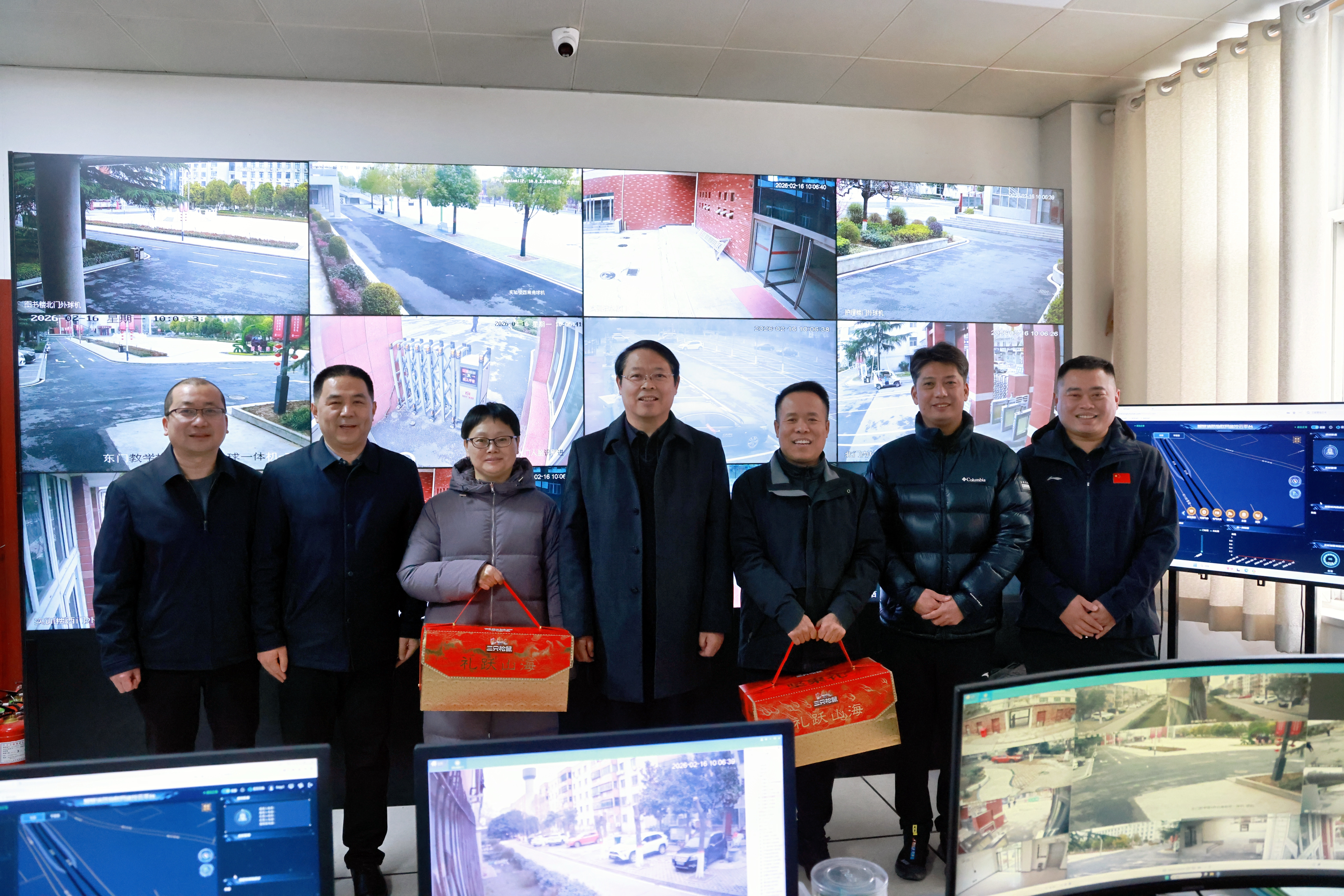 2月16日上午,闫俊山一行到郑州校区开展走访慰问活动。每到一处,闫俊山与值班值守人员亲切交谈,详细询问寒假及春节期间校园安保巡逻、消防安全防控、水电设施运维、应急处置准备等各项工作落实情况,详细了解值守人员的食宿保障和节日安排,对大家不畏严寒、坚守一线的责任担当表示敬意,对过去一年来大家在校园安全、后勤保障等岗位上的辛勤付出给予充分肯定。他表示,春节是万家团圆的美好时刻,更是守护校园平安的关键节点,要时刻绷紧安全之弦,严格执行值班值守制度,强化校园全方位巡逻防控,落实各项服务保障措施,扎实做好应急处置准备,全力确保假期校园安全稳定,度过一个平安祥和的新春佳节。