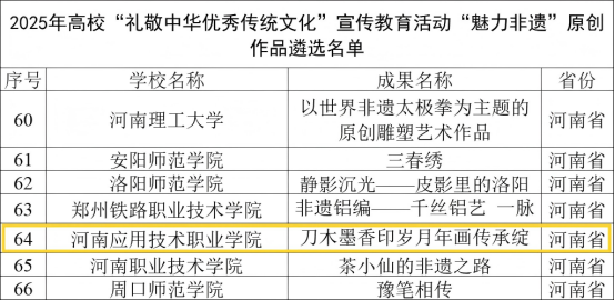 近日,教育部办公厅公布2025年高校“礼敬中华优秀传统文化”宣传教育活动结果,我校报送的作品《刀木墨香印岁月,年画传承绽芳华》,经层层推荐与专家评审,从全国高校中脱颖而出,成功获评“魅力非遗”优秀原创作品。此次获奖实现了我校在该项国家级品牌活动中零的突破。