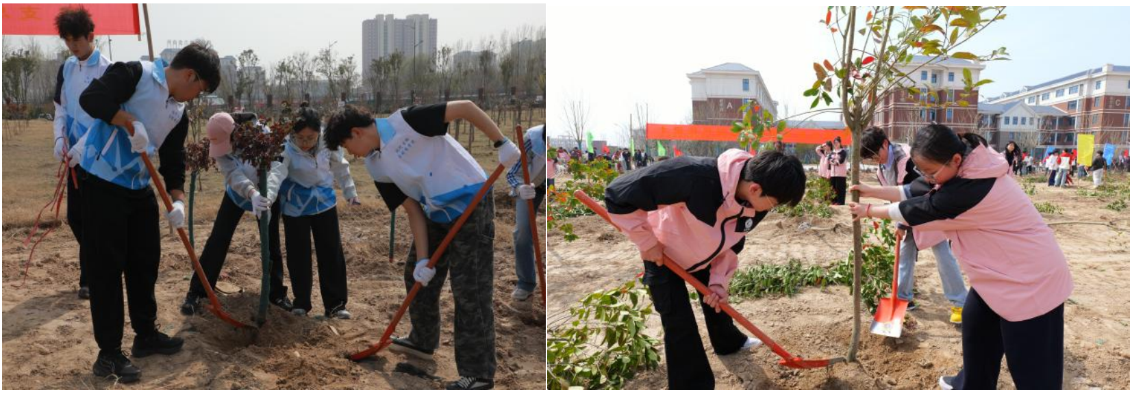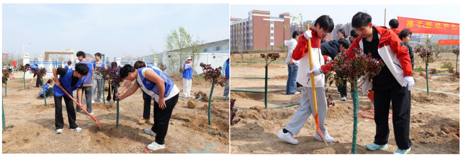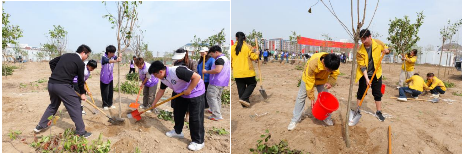 活动现场,热火朝天,干劲十足。党委书记闫俊山、校长薄新党等校领导率先垂范、躬身劳作,与党员师生们一道挥锹培土、扶苗围堰、提水浇灌,精心栽下独杆月季、大叶女贞、法桐等苗木。大家分工协作、配合默契,每一道工序都认真细致、规范有序,一株株新苗迎风挺立,为春日校园再添盎然生机与生态底色。