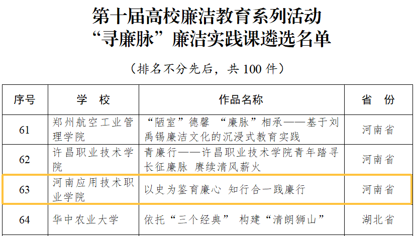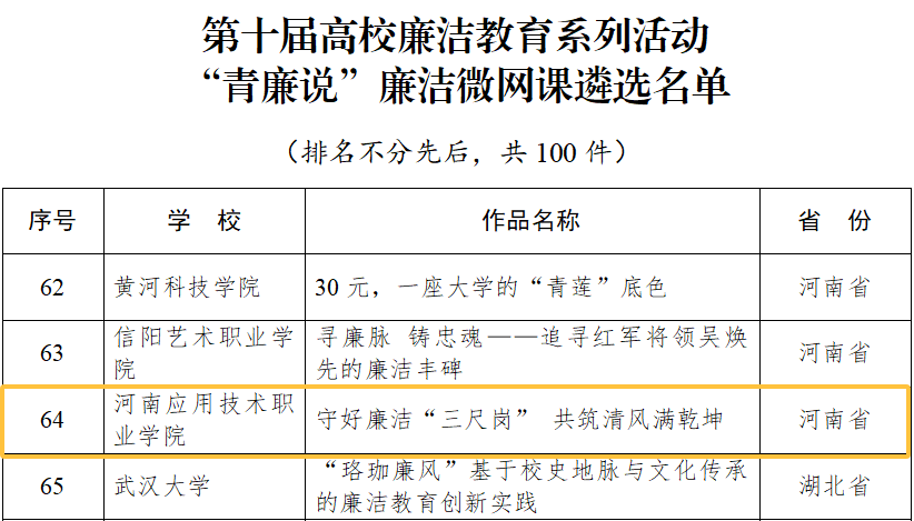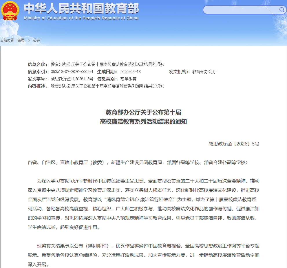 近日,教育部办公厅公布2025年第十届高校廉洁教育系列活动结果,我校报送的《守好廉洁“三尺岗” 共筑清风满乾坤》《以史为鉴育廉心 知行合一践廉行》两项作品,经层层推荐与专家评审,从全国高校中脱颖而出,分别入选“青廉说”廉洁微网课、“寻廉脉”廉洁实践课遴选名单。此次双项入选,是我校深入推进清廉学校建设、扎实开展廉洁文化育人工作的又一标志性成果。