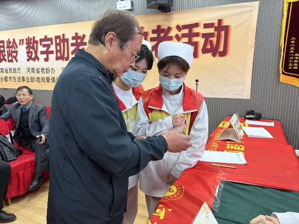 活动现场,党员师生志愿者们分工明确、热情服务,围绕健康保障和数字技能提升两大核心内容开展服务。志愿者们为到场老年人提供免费血压测量、血糖检测服务,同时,还针对老年人在慢性病管理、冬季养生等方面的疑问,进行一对一专业解答,提供科学实用的健康指导,得到老年朋友们的一致好评。