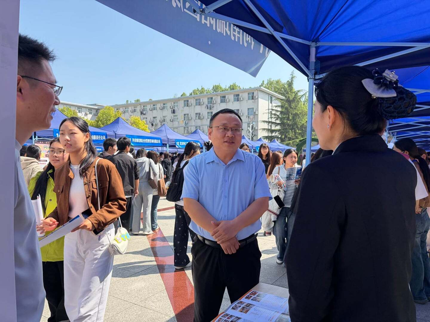 学院党总支书记张忠勇亲临现场巡视指导,与用人单位深入沟通行业趋势及招聘需求,关切询问毕业生求职情况,为学子加油鼓劲。学院工作人员与志愿者全程在岗,做好各项服务保障,确保双选会高效顺畅。
