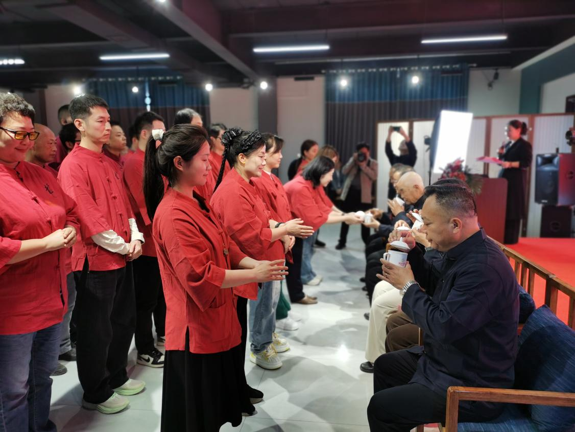 现场为四期优秀学员颁奖后,出师指导师傅登台,学员依次敬茶、三鞠躬,感恩师傅栽培,师傅们颁发出师帖并寄予期许,学员代表也分享了学艺心得并作出传承承诺;随后,五期学员拜师仪式接续举行,班长宣读拜师帖,学员依次向师傅敬茶,正式确立师徒关系,师傅们为学员颁发回师帖,学员代表发表谢师感言。