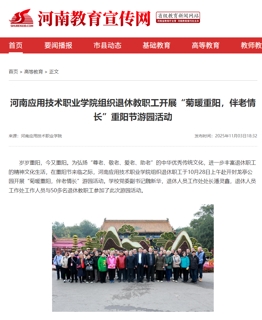 岁岁重阳,今又重阳。为弘扬“尊老、敬老、爱老、助老”的中华优秀传统文化,进一步丰富退休职工的精神文化生活,在重阳节来临之际,河南应用技术职业学院组织退休职工于10月28日上午赴开封龙亭公园开展“菊暖重阳,伴老情长”游园活动。学校党委副书记魏新华,退休人员工作处处长潘灵鑫,退休人员工作处工作人员与50多名退休教职工参加了此次游园活动。