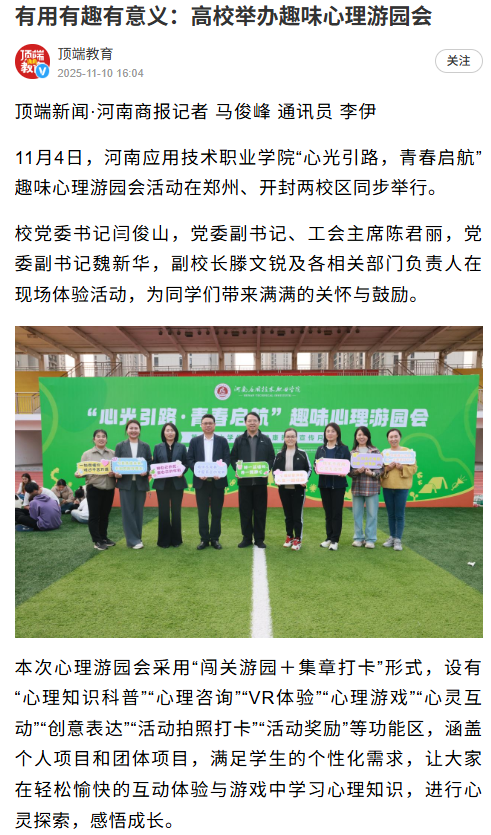 11月4日,河南应用技术职业学院“心光引路,青春启航”趣味心理游园会活动在郑州、开封两校区同步举行。
