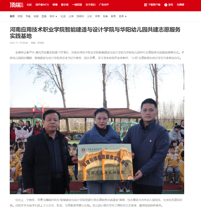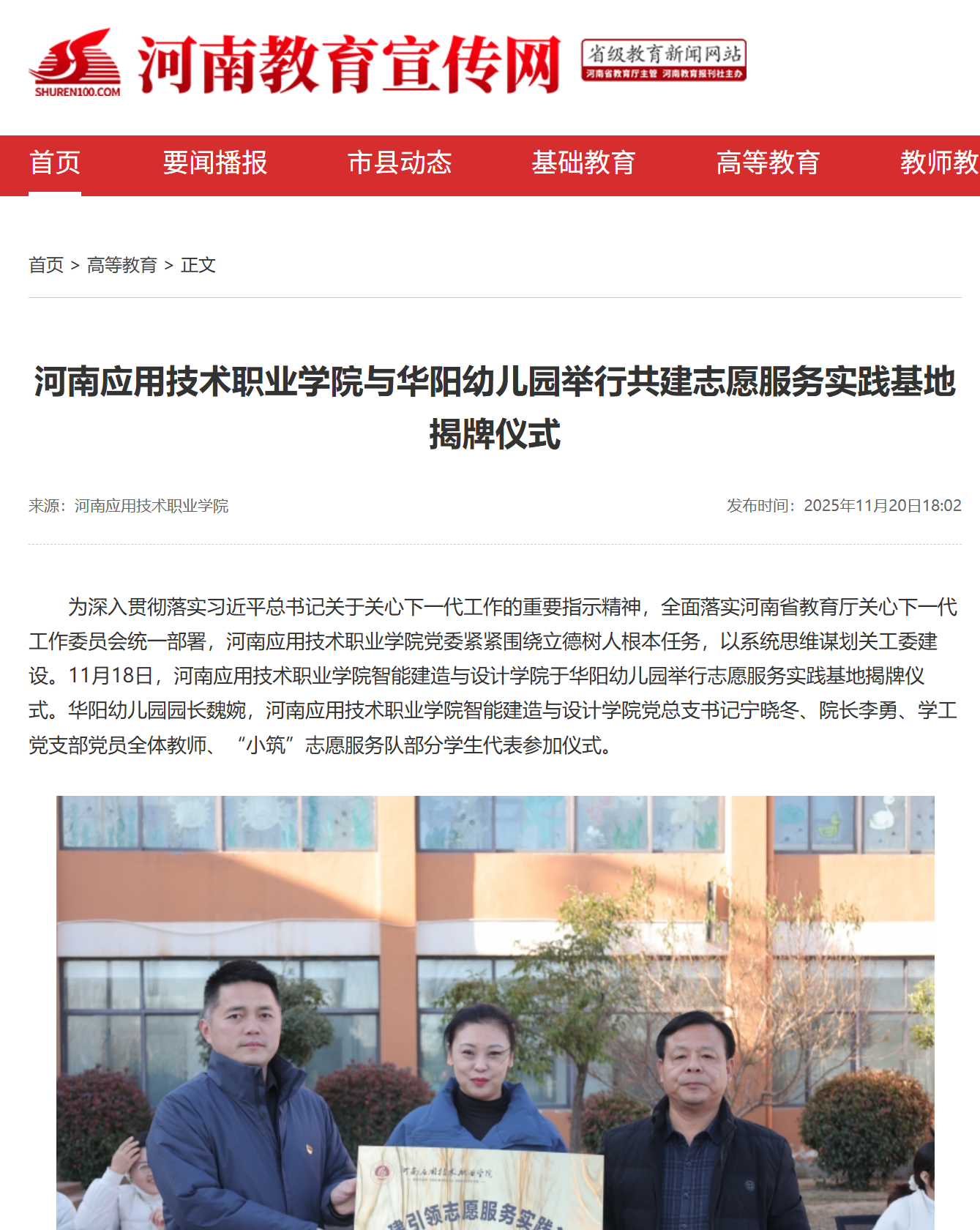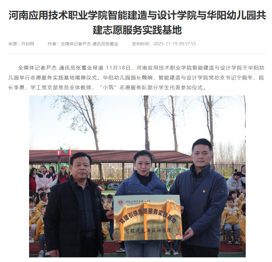 11月18日,河南应用技术职业学院智能建造与设计学院于华阳幼儿园举行志愿服务实践基地揭牌仪式。华阳幼儿园园长魏婉,智能建造与设计学院党总支书记宁晓冬、院长李勇,学工党支部党员全体教师,“小筑”志愿服务队部分学生代表参加仪式。