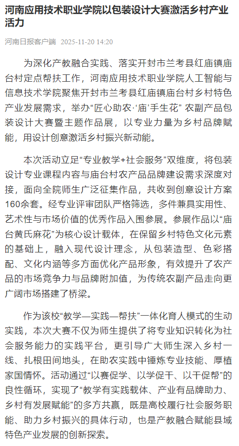 为深化产教融合实践、落实开封市兰考县红庙镇庙台村定点帮扶工作,河南应用技术职业学院人工智能与信息技术学院聚焦开封市兰考县红庙镇庙台村乡村特色产业发展需求,举办“匠心助农·‘庙’手生花” 农副产品包装设计大赛暨主题作品展,以专业力量为乡村品牌赋能,用设计创意激活乡村振兴新动能。