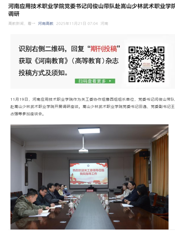 11月19日,河南应用技术职业学院作为关工委协作组豫西组组长单位,党委书记闫俊山带队赴嵩山少林武术职业学院开展调研座谈。嵩山少林武术职业学院党委书记田逸、党委副书记王占强等参加座谈会。