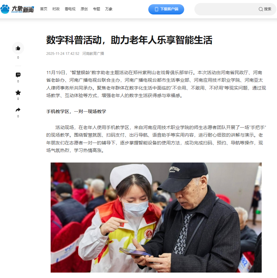 11月19日,“智慧银龄”数字助老主题活动在郑州紫荆山老戏骨俱乐部举行。本次活动由河南省民政厅、河南省老龄办、河南广播电视台联合主办,河南广播电视台都市生活事业部、河南应用技术职业学院、河南亚太人律师事务所共同承办。聚焦老年群体在数字化生活中面临的“不会用、不敢用、不好用”等现实问题,通过现场教学、互动体验等方式,增强老年人的数字生活获得感与幸福感。