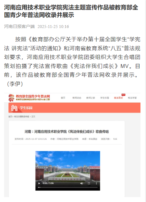 按照《教育部办公厅关于举办第十届全国学生“学宪法 讲宪法”活动的通知》和河南省教育系统“八五”普法规划要求,河南应用技术职业学院团委组织大学生合唱团策划拍摄了宪法宣传歌曲《宪法伴我们成长》MV。目前,该作品被教育部全国青少年普法网收录并展示。