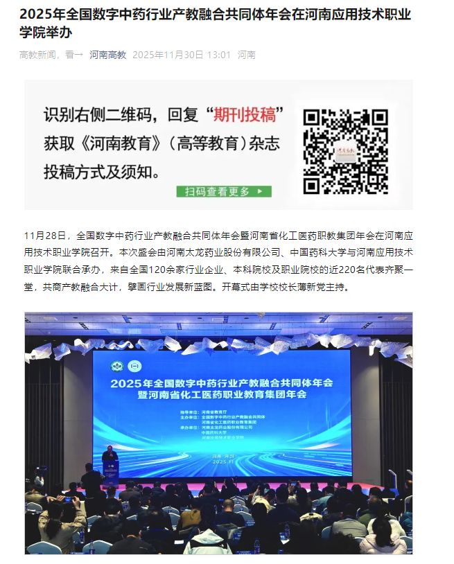 11月28日,全国数字中药行业产教融合共同体年会暨河南省化工医药职教集团年会在河南应用技术职业学院召开。本次盛会由河南太龙药业股份有限公司、中国药科大学与河南应用技术职业学院联合承办,来自全国120余家行业企业、本科院校及职业院校的近220名代表齐聚一堂,共商产教融合大计,擘画行业发展新蓝图。开幕式由学校校长薄新党主持。