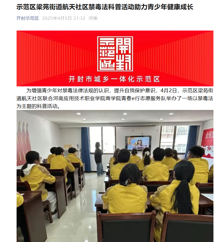 为增强青少年对禁毒法律法规的认识,提升自我保护意识,4月2日,示范区梁苑街道航天社区联合河南应用技术职业学院商学院青春e行志愿服务队举办了一场以禁毒法为主题的科普活动。