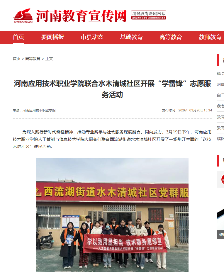 为深入践行新时代雷锋精神,推动专业所学与社会服务深度融合、同向发力,3月19日下午,河南应用技术职业学院人工智能与信息技术学院志愿者们联合西流湖街道水木清城社区开展了一场别开生面的“送技术进社区”便民活动。