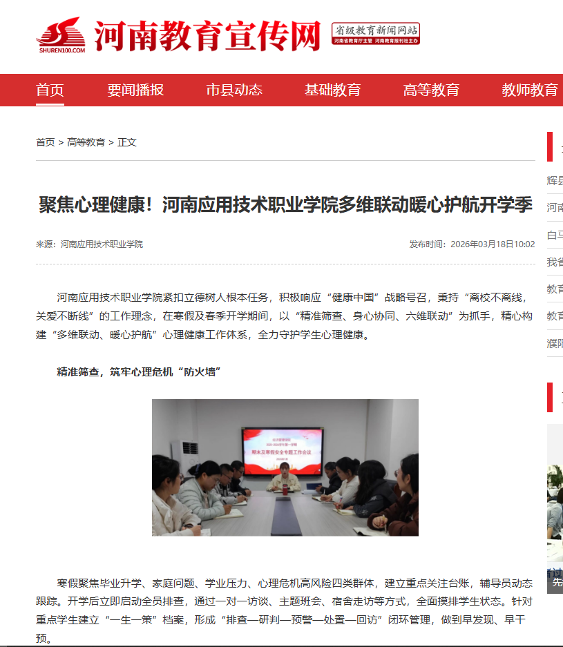 河南应用技术职业学院紧扣立德树人根本任务,积极响应“健康中国”战略号召,秉持“离校不离线,关爱不断线”的工作理念,在寒假及春季开学期间,以“精准筛查、身心协同、六维联动”为抓手,精心构建“多维联动、暖心护航”心理健康工作体系,全力守护学生心理健康。