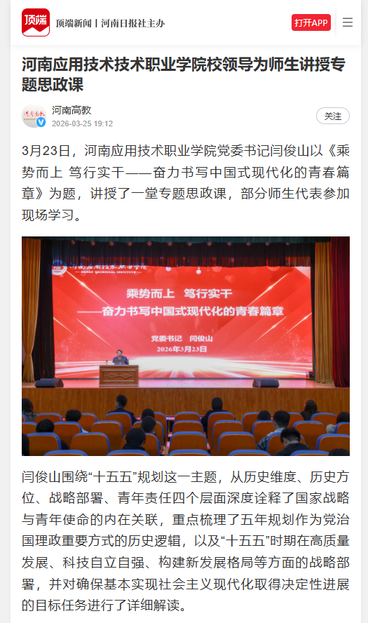 3月23日,河南应用技术职业学院党委书记闫俊山以《乘势而上 笃行实干——奋力书写中国式现代化的青春篇章》为题,讲授了一堂专题思政课,部分师生代表参加现场学习。