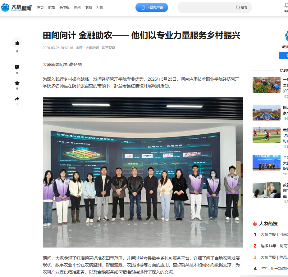 为深入践行乡村振兴战略,发挥经济管理学院专业优势,2026年3月23日,河南应用技术职业学院经济管理学院多名师生在院长张召哲的带领下,赴兰考县红庙镇开展调研活动。