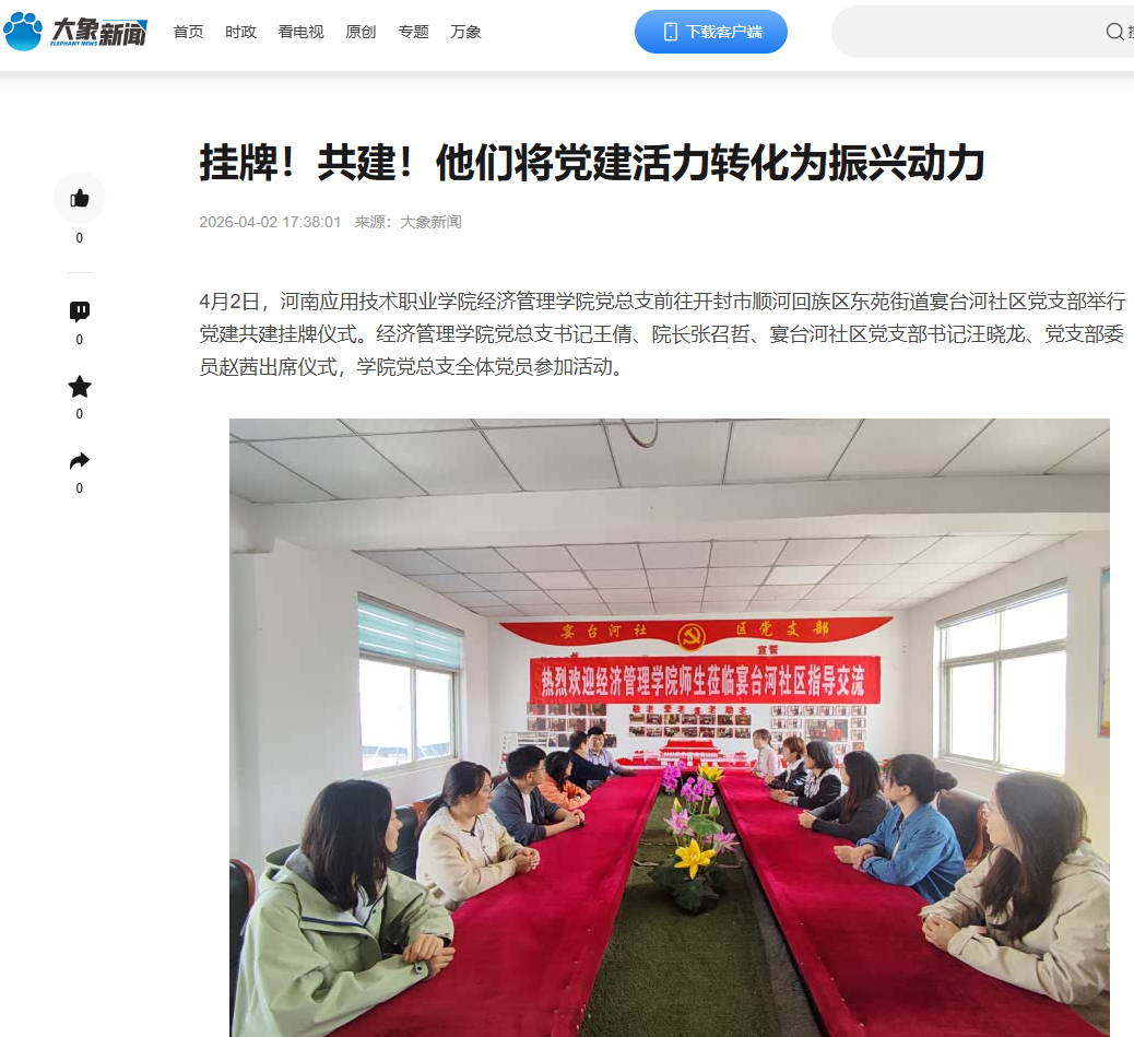 4月2日,河南应用技术职业学院经济管理学院党总支前往开封市顺河回族区东苑街道宴台河社区党支部举行党建共建挂牌仪式。经济管理学院党总支书记王倩、院长张召哲、宴台河社区党支部书记汪晓龙、党支部委员赵茜出席仪式,学院党总支全体党员参加活动。