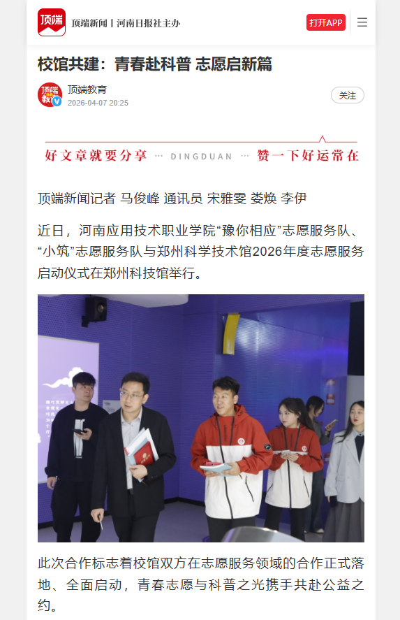 近日,河南应用技术职业学院“豫你相应”志愿服务队、“小筑”志愿服务队与郑州科学技术馆2026年度志愿服务启动仪式在郑州科技馆举行。