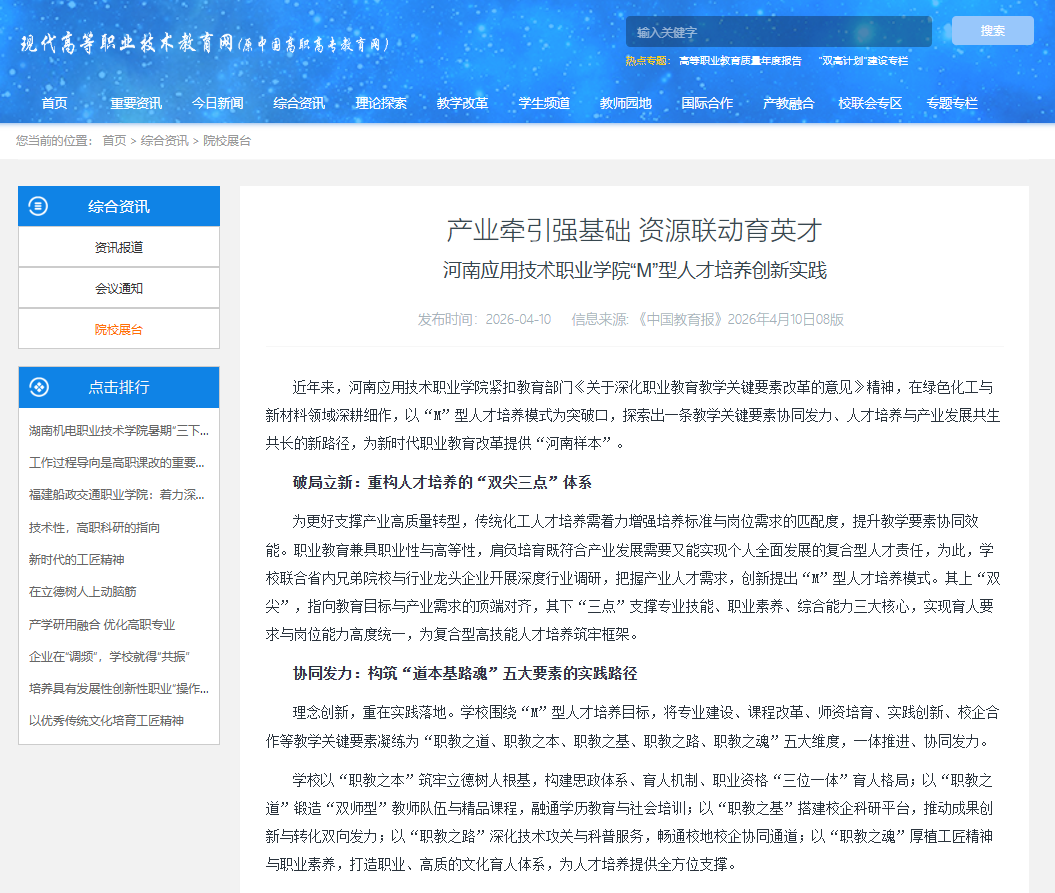 近年来,河南应用技术职业学院紧扣教育部门《关于深化职业教育教学关键要素改革的意见》精神,在绿色化工与新材料领域深耕细作,以“M”型人才培养模式为突破口,探索出一条教学关键要素协同发力、人才培养与产业发展共生共长的新路径,为新时代职业教育改革提供“河南样本”。