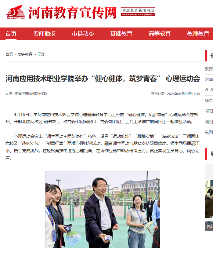 4月16日,由河南应用技术职业学院心理健康教育中心主办的“健心健体,筑梦青春”心理运动会在郑州、开封北院两校区同步举行。校党委书记闫俊山,党委副书记、工会主席陈君丽同师生一起体验活动。