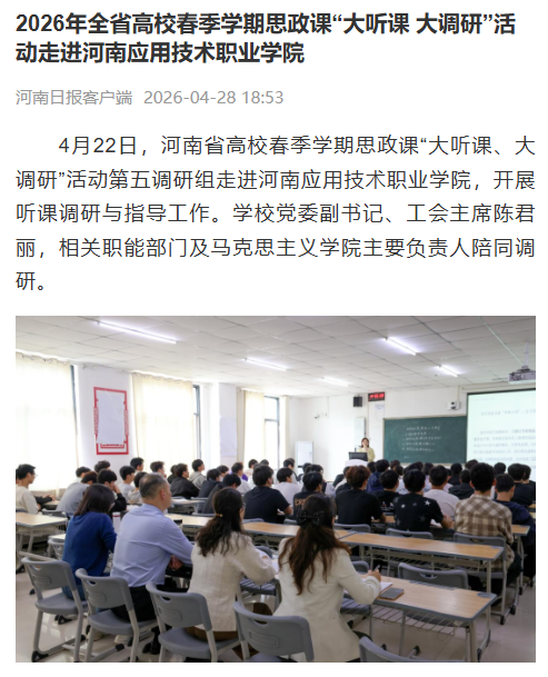 4月22日,河南省高校春季学期思政课“大听课、大调研”活动第五调研组走进河南应用技术职业学院,开展听课调研与指导工作。学校党委副书记、工会主席陈君丽,相关职能部门及马克思主义学院主要负责人陪同调研。