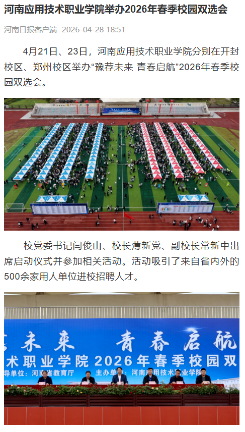 4月21日、23日,河南应用技术职业学院分别在开封校区、郑州校区举办“豫荐未来 青春启航”2026年春季校园双选会。
