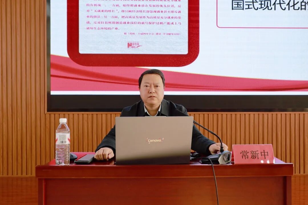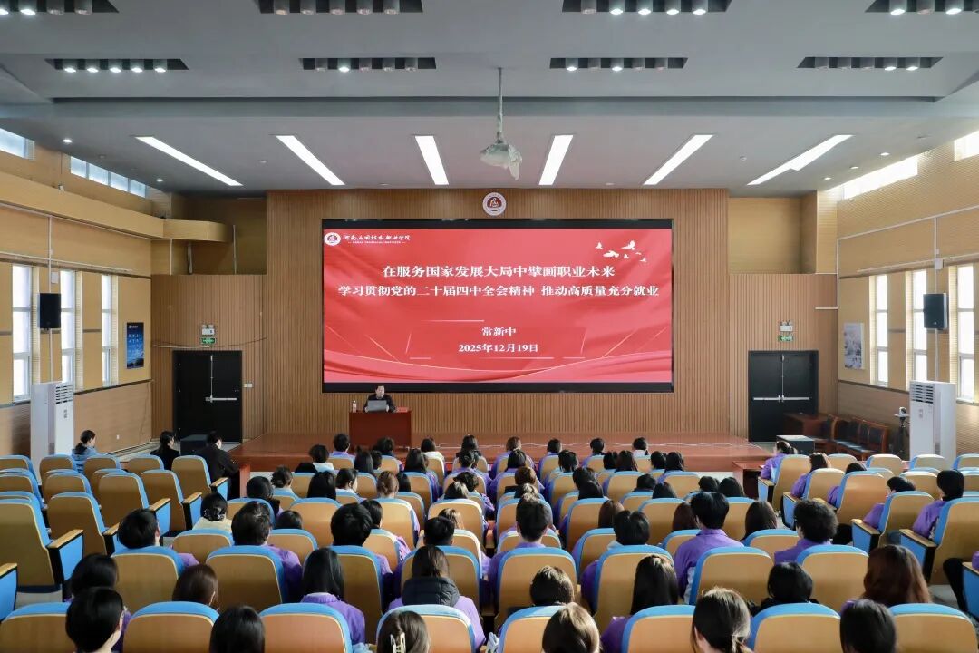 12月19日,学校副校长、开封校区管委会副主任常新中以“在服务国家发展大局中擘画职业未来——学习贯彻党的二十届四中全会精神,推动高质量充分就业”为主题,为现代生物与制药学院师生代表讲授了一堂生动的专题思政课。
